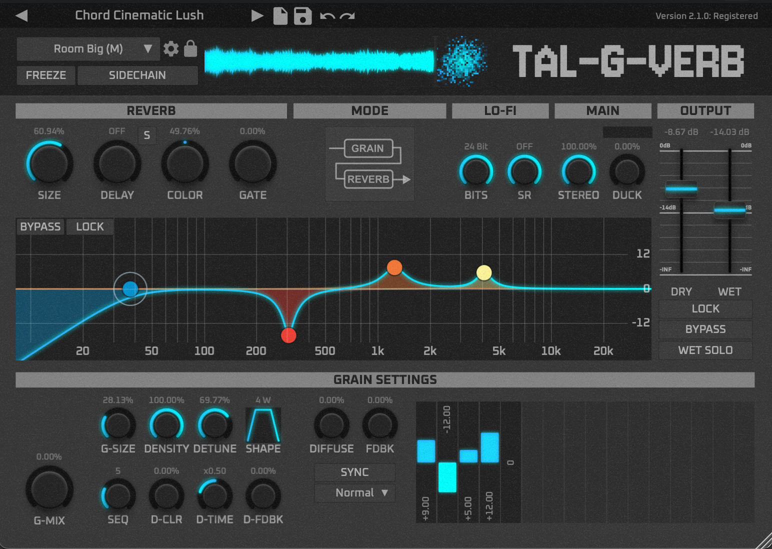 The included graphic EQ can be used to shape the output spectrum of the reverb. A single color control determines how much the reverb is modulated. No color results in a crystal clear reverb, a large amount of color results in a broader and more diffuse reverb sound.