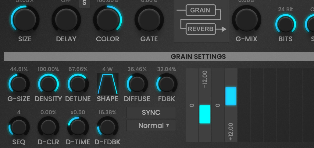 The grain engine can be used to pitch the sound with different pitch offsets or add more chaos and variation to the final reverb output. Different routings are possible.